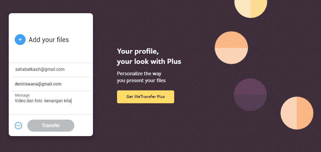 Alternatif lainnya selain cloud storage untuk mengirim file berukuran besar yaitu layanan WeTransfer. WeTransfer adalah layanan online yang memang khusus dibuat untuk mengirim file yang berukuran besar melalui Email. Dengan layanan ini, sobat dapat mengirim file yang berukuran hingga 2 GB ke alamat Email tujuan sobat.