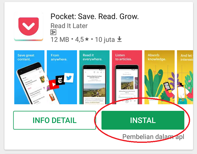 Langkah pertama, silahkan download kemudian install terlebih dahulu aplikasi Pocket di smartphone sobat.