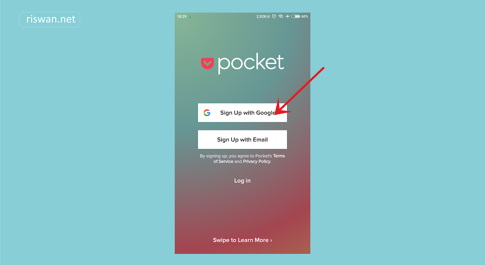 Langkah kedua, kemudian buka aplikasi Pocket, lalu tap Sign Up with Google / Email untuk mendaftar ke aplikasi. Jika sudah tap Log in. Selanjutnya silahkan buka aplikasi browser Chrome dan cari artikel atau informasi yang ingin sobat baca saat offline.