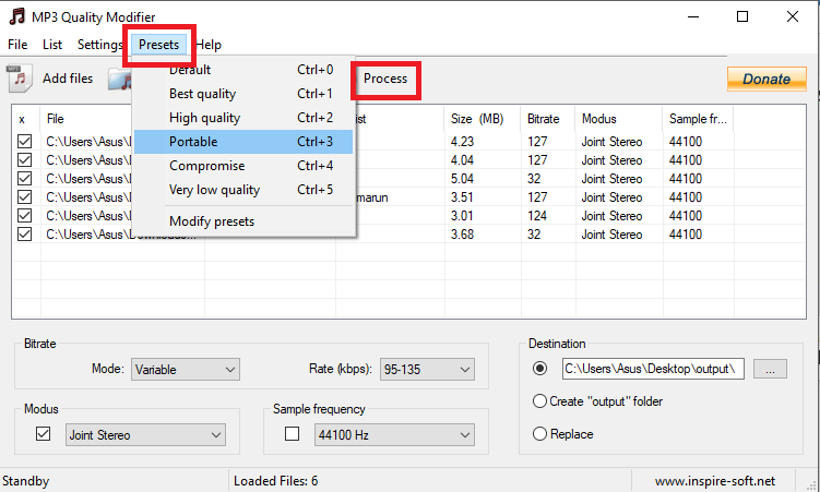 Klik Preset, kemudian pilih kualitas yang sobat inginkan. Dalam tutorial ini, karena saya hanya menginginkan perubahan pada ukuran file tanpa mengubah kualitas suara, saya pilih Portable. Lalu klik Process untuk memulai convert.