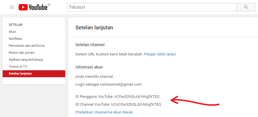 Sobat dapat melihat ID pengguna channel dan ID channel di setelan lanjutan akun.