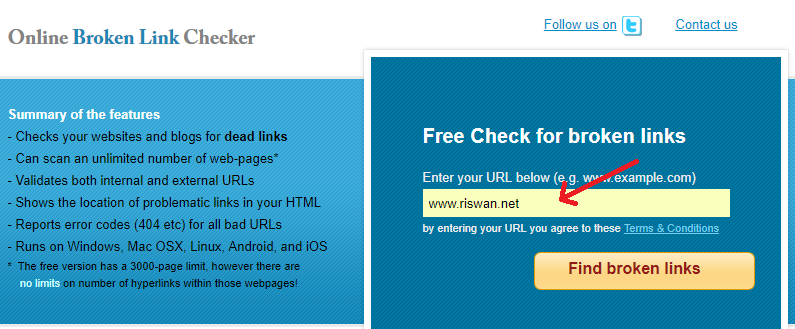 Pertama saya akan menjelaskan dulu nabaimana cara mengetahui broken link pada blog, di sini kita akan menggunakan bantuan tools supaya mudah dan praktis, silahkan sobat kunjungi brokenlinkcheck.com