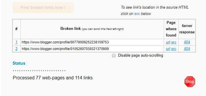 Setelah scanning broken link selesai, maka sobat akan mendapatkan daftar link yang mati, seperti pada gambar di bawah ini: