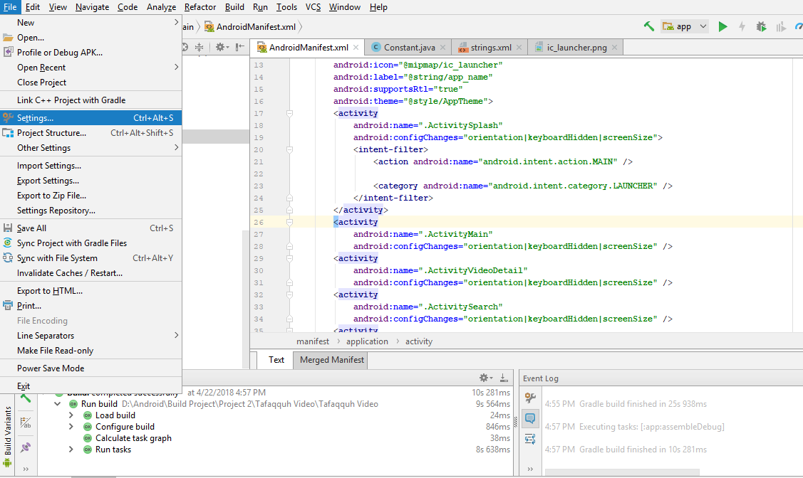 Pertama buka aplikasi Android Studio, lalu masuk ke pengaturan, caranya Klik File >> Settings, untuk cara cepatnya dengan kombinasi keyboard CTR + ALT + S.