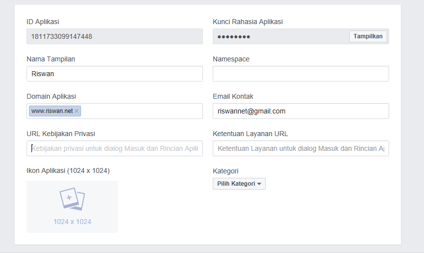 Isi nama tampilan dengan nama yang anda inginkan, domain aplikasi diisi dengan url blog sobat. Namespace dikosongkan tidak apa-apa. Untuk URL Kebijakan Privasi bisa diisi dengan URL kebijakan privasi aplikasi facebook yang telah anda buat.